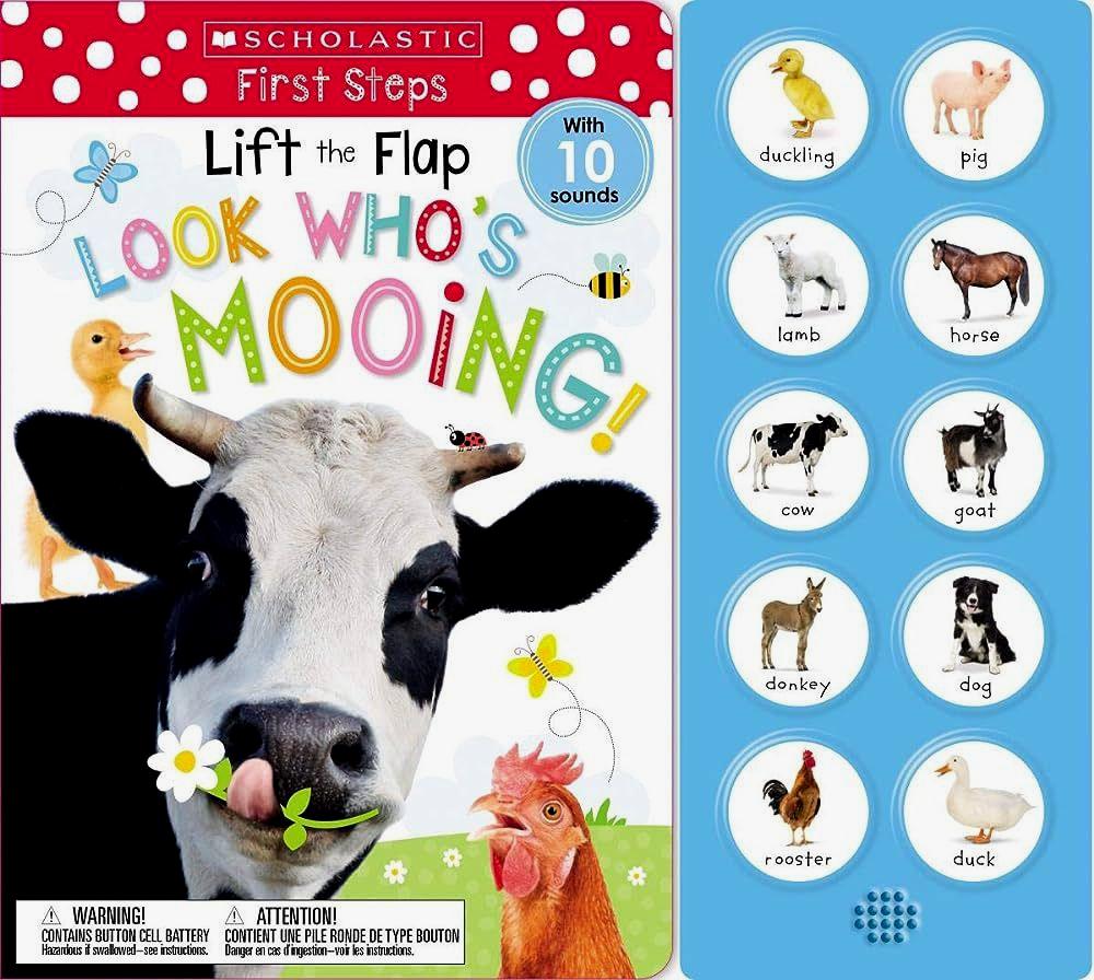 Look Who's Mooing! is a multi-button sound book with flaps to link pictures, words, and animal sounds.Each of the 10 sound buttons in the sound bar provides one animal word. Children can look at the picture of the animal, press the button, and hear the sound! The book also features 25 different kinds of animals -- from down on the farm to deep in the ocean!Flaps throughout the book also reveal the baby name of each animal for extra learning and interactivity.Scholastic Early Learners: The Most Trusted Name in Learning!